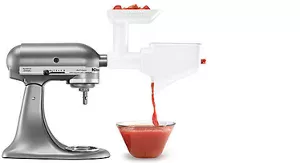 The fruit and vegetable strainer parts attach to the KitchenAid Food Grinder Attachment (sold separately) to help you create incredible homemade applesauce, jelly or baby food in minutes. Once ingredients are through the grinder, the strainer cone removes any peels, leaving you with finely pureed fruits or vegetables.